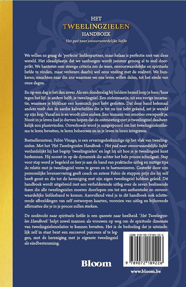 Bestsellerauteur, Fabio Vinago, is een ervaringsdeskundige op het vlak van tweelingzielen. Met het ‘Het Tweelingzielen Handboek – Het pad naar onvoorwaardelijke liefde’ verduidelijkt hij het begrip 'tweelingzielen' en legt hij uit hoe je je tweelingziel kunt herkennen. Hij zoomt in op de dynamiek die achter het hele proces schuilgaat. Stap voor stap word je begeleid en leer je aan de hand van praktische uitleg en nuttige tips de relatie met je tweelingziel vorm te geven en te harmoniseren. Gesterkt door zijn persoonlijke levenservaring geeft coach en auteur Fabio de stappen prijs die hij zelf heeft gezet en die tot de hereniging met zijn eigen tweelingziel hebben geleid. Dit handboek wordt uitgebreid met een verhelderende uitleg over de zeven beslissende fasen die alle tweelingzielen moeten doorlopen om tot een authentieke en onvoorwaardelijke liefdesband te komen. Aanvullend vind je in dit handboek ook schitterende afbeeldingen van zelf ontworpen kaarten, voorzien van uitleg en bijhorende affirmaties die je in je proces zullen sterken.