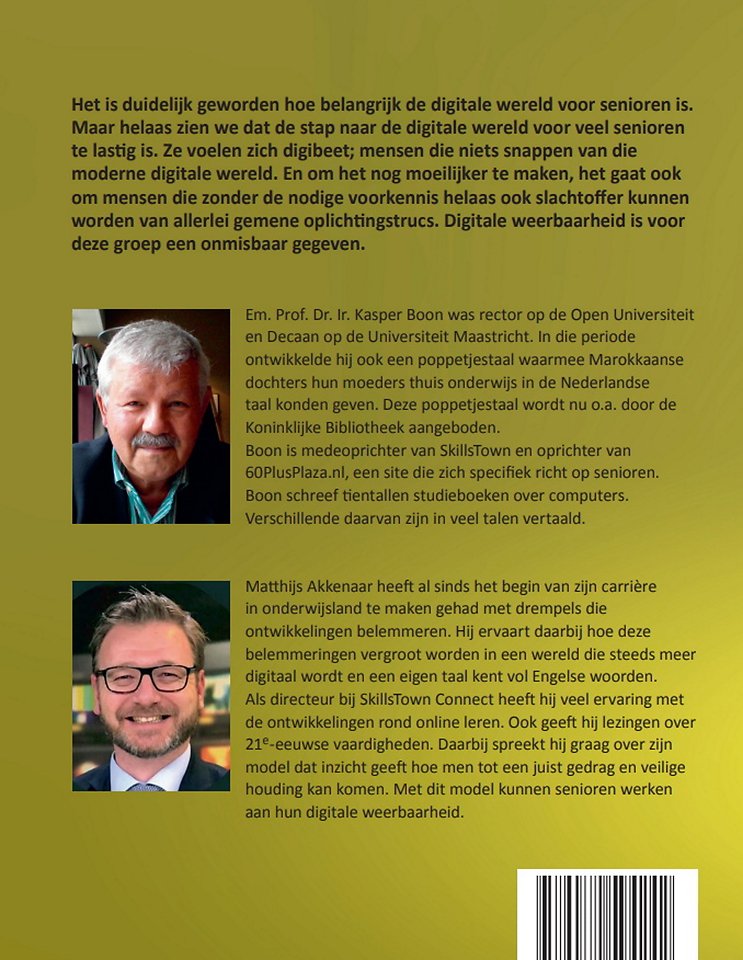 Het is duidelijk geworden hoe belangrijk de digitale wereld voor senioren is. Maar helaas zien we dat de stap naar de digitale wereld voor veel senioren te lastig is. Ze voelen zich digibeet; mensen die niets snappen van die moderne digitale wereld. En om het nog moeilijker te maken, het gaat ook om mensen die zonder de nodige voorkennis helaas ook slachtoffer kunnen worden van allerlei gemene oplichtingstrucs. Digitale weerbaarheid is voor deze groep een onmisbaar gegeven. Merkwaardig dat er nog geen boek over dit onderwerp was. De auteurs Kasper Boon en Matthijs Akkenaar vullen die leemte nu in met "Digitale weerbaarheid voor senioren".