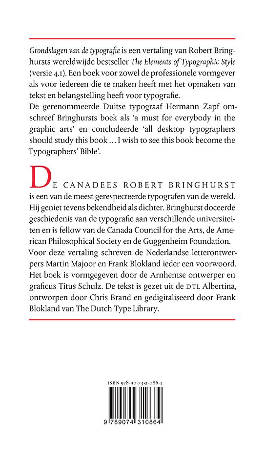 Voor deze vertaling schreven de Nederlandse letterontwerpers Martin Majoor en Frank Blokland ieder een voorwoord. Het boek is vormgegeven door de Arnhemse ontwerper en graficus Titus Schulz. De tekst is gezet uit de DTL Albertina, ontworpen door Chris Brand, gedigitaliseerd door Frank Blokland van Dutch Type Library.