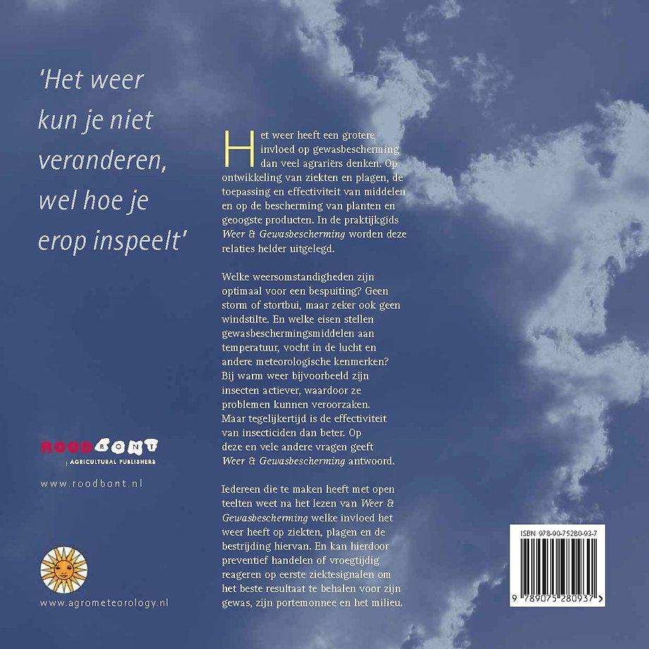 Het weer heeft een grotere invloed op gewasbescherming dan veel agrariërs denken. Op ontwikkeling van ziekten en plagen, de toepassing en effectiviteit van middelen en op de bescherming van planten en geoogste producten. In de praktijkgids Weer & Gewasbescherming worden deze relaties helder uitgelegd. Welke weersomstandigheden zijn optimaal voor een bespuiting? Geen storm of stortbui, maar zeker ook geen windstilte. En welke eisen stellen gewasbeschermingsmiddelen aan temperatuur, vocht in de lucht en andere meteorologische kenmerken? Bij warm weer bijvoorbeeld zijn insecten actiever, waardoor ze problemen kunnen veroorzaken. Maar tegelijkertijd is de effectiviteit van insecticiden dan beter. Op deze en vele andere vragen geeft Weer & Gewasbescherming antwoord. Iedereen die te maken heeft met open teelten weet na het lezen van Weer & Gewasbescherming welke invloed het weer heeft op ziekten, plagen en de bestrijding hiervan. En kan hierdoor preventief handelen of vroegtijdig reageren op eerste ziektesignalen om het beste resultaat te behalen voor zijn gewas, zijn portemonnee en het milieu.