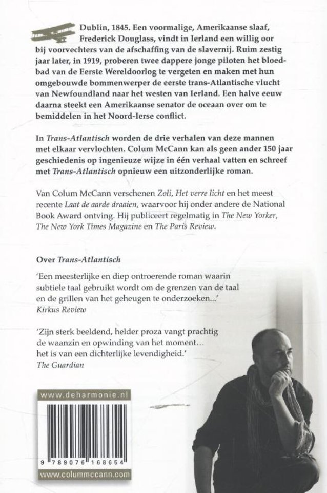 In Trans-Atlantisch, de nieuwe roman van Colum McCann, worden de drie verhalen van deze mannen op ingenieuze wijze met elkaar vervlochten door vrouwen die de oversteek naar Amerika en terug naar Ierland hebben gemaakt. McCann kan als geen ander 150 jaar geschiedenis op een meesterlijke manier in één verhaal vatten en creëert met Trans-Atlantisch opnieuw een uitzonderlijke roman.