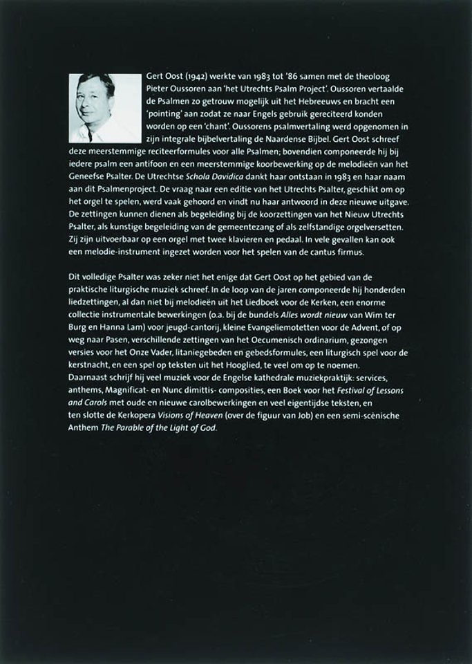 Gert Oost (1942) werkte van 1983 tot '86 samen met de theoloog Pieter Oussoren aan 'het Utrechts Psalm Project'. Oussoren vertaalde de Psalmen zo getrouw mogelijk uit het Hebreeuws en bracht een 'pointing' aan zodat ze naar Engels gebruik gereciteerd konden worden op een 'chant'. Oussorens psalmvertaling werd opgenomen in zijn integrale bijbelvertaling de Naardense Bijbel. Gert Oost schreef deze meerstemmige reciteerformules voor alle Psalmen; bovendien componeerde hij bij iedere psalm een antifoon en een meerstemmige koorbewerking op de melodieën van het Geneefse Psalter. De Utrechtse Schola Davidica dankt haar ontstaan in 1983 en haar naam aan dit Psalmenproject. De vraag naar een editie van het Utrechts Psalter, geschikt om op het orgel te spelen, werd vaak gehoord en vindt nu haar antwoord in deze nieuwe uitgave. De zettingen kunnen dienen als begeleiding bij de koorzettingen van het Nieuw Utrechts Psalter, als kunstige begeleiding van de gemeentezang of als zelfstandige orgelversetten. Zij zijn uitvoerbaar op een orgel met twee klavieren en pedaal. In vele gevallen kan ook een melodie-instrument ingezet worden voor het spelen van de cantus firmus.