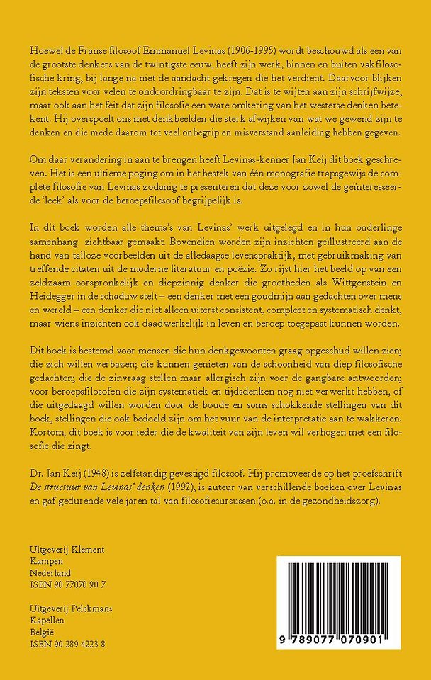 Om daar verandering in aan te brengen heeft Levinas-kenner Jan Keij dit boek geschreven. Het is een ultieme poging om in het bestek van één monografie trapsgewijs de complete filosofie van Levinas zodanig te presenteren dat deze voor zowel de geïnteresseerde 'leek' als voor de beroepsfilosoof begrijpelijk is.