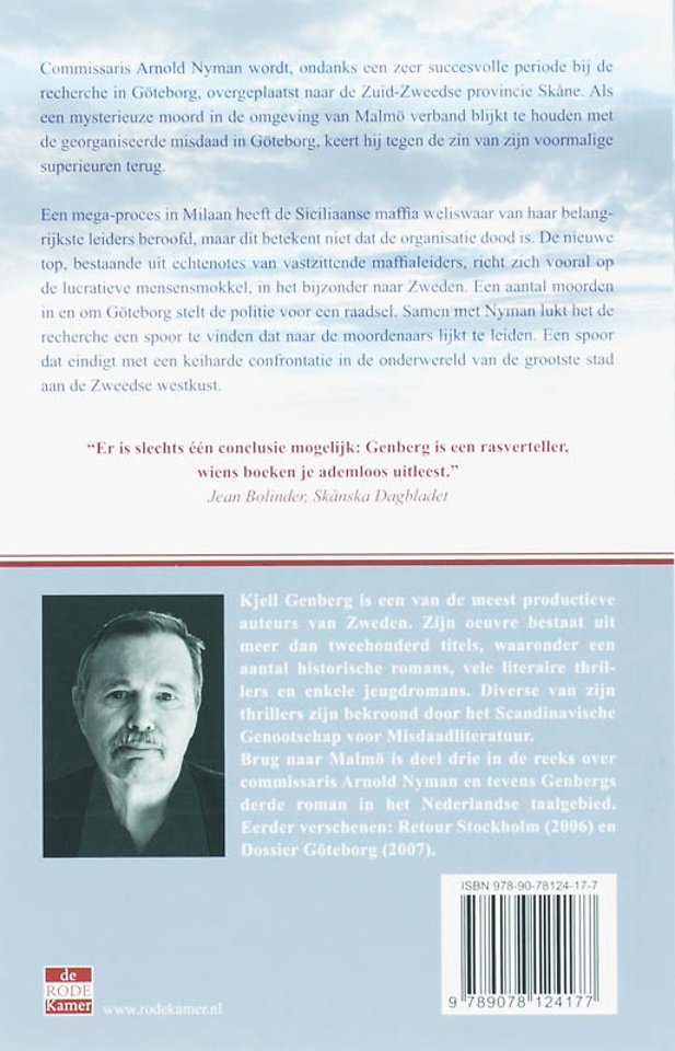 Kjell Genberg is een van de meest productieve auteurs van Zweden. Zijn oeuvre bestaat uit meer dan tweehonderd titels, waaronder een aantal historische romans, vele literaire thrillers en enkele jeugdromans. Diverse van zijn thrillers zijn bekroond door het Scandinavische Genootschap voor misdaadliteratuur. Brug naar Malmö is deel drie in de reeks over commissaris Arnold Nyman en tevens Genbergs derde roman in het Nederlandse taalgebied. Eerder verschenen van zijn hand: Retour Stockholm (2006) en Dossier Göteborg (februari 2007).