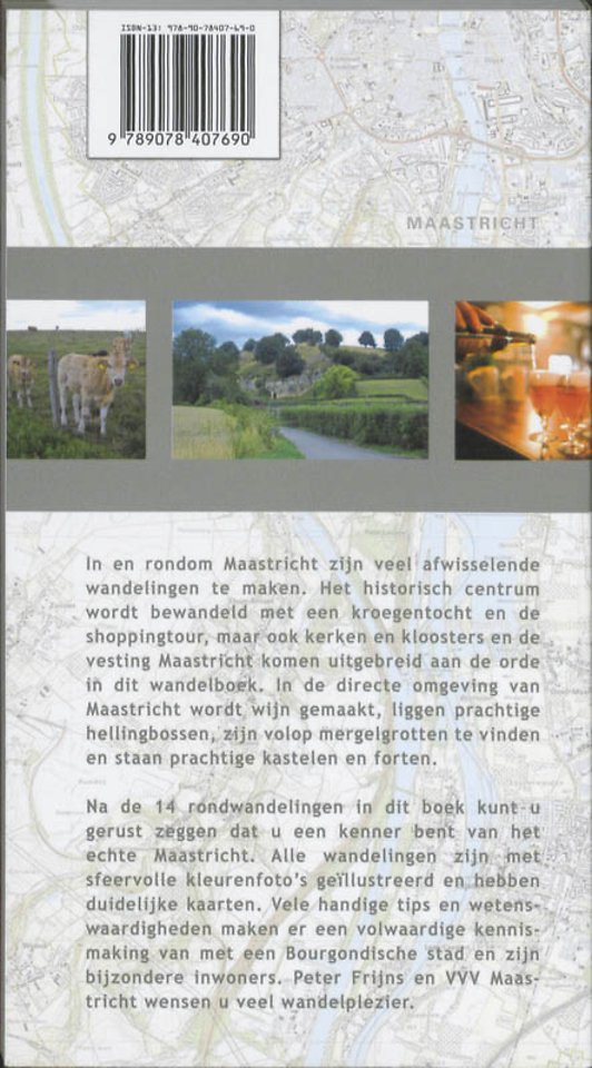 Na de 14 wandelingen in dit boek kunt u gerust zeggen dat u een kenner bent van het echte Maastricht. Alle wandelingen zijn met sfeervolle kleurenfoto's geïllustreerd en hebben duidelijke kaarten. Vele handige tips en wetenswaardigheden maken er een volwaardige kennismaking van met een Bourgondische stad en zijn bijzondere inwoners. Peter Frijns en VVV Maastricht wensen u veel wandelplezier.