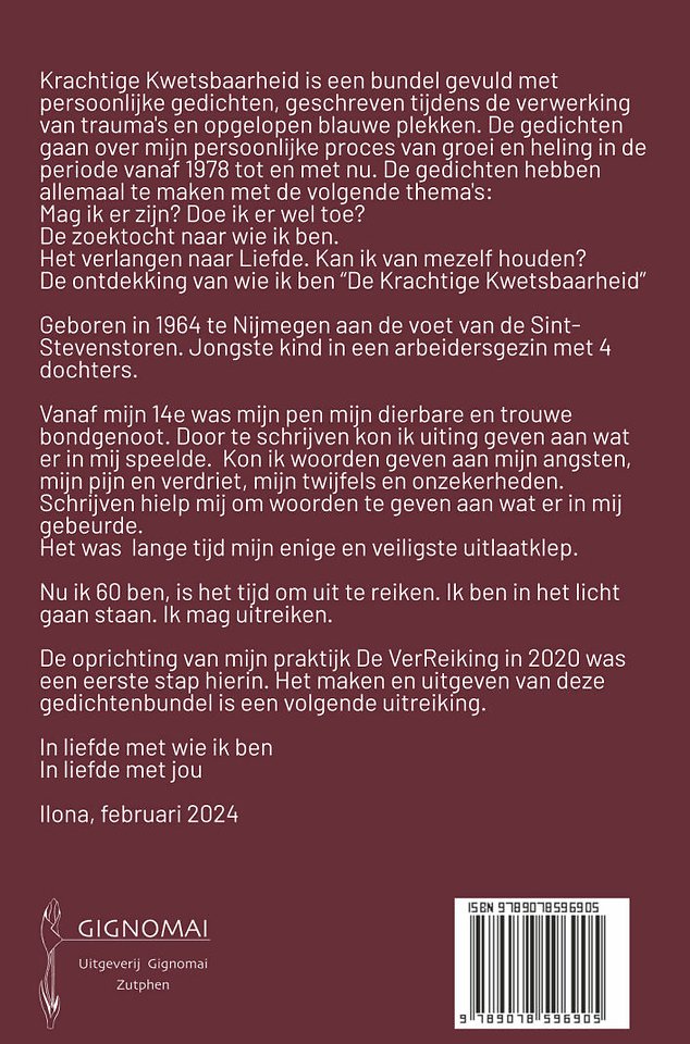Krachtige Kwetsbaarheid is een bundel gevuld met persoonlijke gedichten, geschreven tijdens de verwerking van trauma's en opgelopen blauwe plekken. De gedichten gaan over mijn persoonlijke proces van groei en heling in de periode vanaf 1978 tot en met nu. De gedichten hebben allemaal te maken met de volgende thema's: