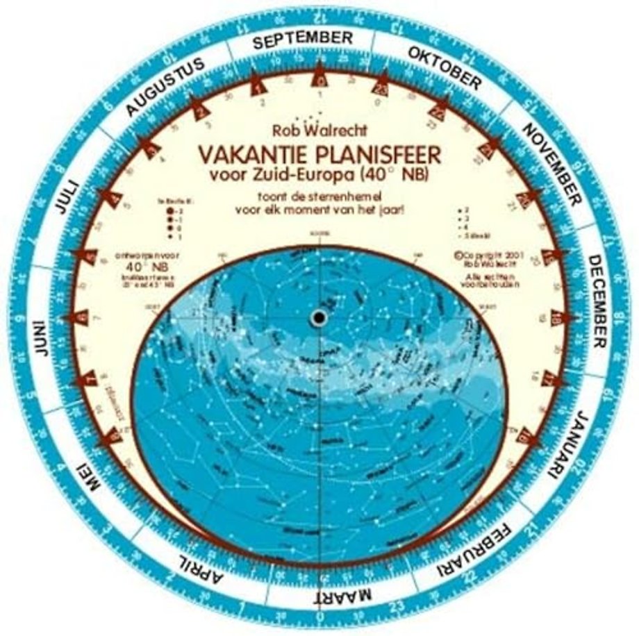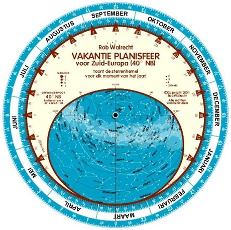 Nederlandse planisfeer voor 40º NB , zeer nauwkeurig voor elk gebied tussen 35º en 45º NB. De naam "vakantieplanisfeer voor Zuid-Europa" benadrukt dat men tijdens de vakantie juist vaak schitterende kansen heeft om een fraaie sterrenhemel te bewonderen.