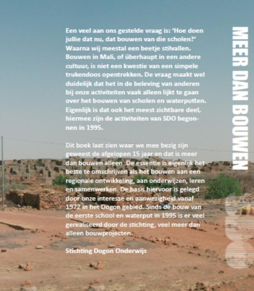 Een veel aan ons gestelde vraag is: Hoe doen jullie dat nu, dat bouwen van die scholen?. Waarna wij meestal een beetje stilvallen. Bouwen in Mali, of überhaupt in een andere cultuur, is niet een kwestie van een simpele trukendoos opentrekken. De vraag maakt wel duidelijk dat het in de beleving van anderen bij onze activiteiten vaak alleen lijkt te gaan over het bouwen van scholen en waterputten. Eigenlijk is dat ook het meest zichtbare deel, hiermee zijn de activiteiten van SDO begonnen in 1995. Dit boek laat zien waar we mee bezig zijn geweest de afgelopen 15 jaar en dat is meer dan bouwen alleen. De essentie is eigenlijk het beste te omschrijven als het bouwen aan een regionale ontwikkeling, aan onderwijzen, leren en samenwerken. De basis hiervoor is gelegd door onze interesse en aanwezigheid vanaf 1972 in het Dogon gebied. Sinds de bouw van de eerste school en waterput in 1995 is er veel gerealiseerd door de stichting, veel meer dan alleen bouwprojecten. De belangrijkste niet fysieke resultaten zijn het moeilijkst meetbaar en inzichtelijk te maken. Met dit boek doen we een poging om ook dit deel voelbaar te maken. Het is een verslag in vogelvlucht van de gerealiseerde projecten, van scholen, woningen, putten, dammen en andere gebouwen. Er is een aantal interviews opgenomen, een paar essays met de overwegingen over de aanpak, de transformatie in bouwtechniek, van bouwen met leem in de beginjaren via zandcement blokken en natuursteen naar bouwen met geperste aarde stenen de laatste jaren. Daarnaast staat het boek vol met fotos van de gerealiseerde projecten, de bouw activiteiten en het uiteindelijke gebruik. Voor de bouw zijn veel tekeningen gemaakt, een klein deel is opgenomen in het boek. De verschillen van aanpak en uitvoering zijn soms moeilijk te onderscheiden, de essentie is in de eenvoud van de bouw en tekeningen te zien: `pas simple, pas bon` is het credo van Joop van Stigt.