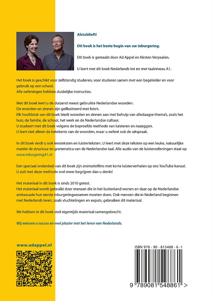 U vindt in het boek ook leesteksten en luisterteksten. U leert met deze teksten op een leuke, natuurlijke manier de structuur en grammatica van de Nederlandse taal. Alle audio van de luisteroefeningen staat op www.inburgeringA1.nl.