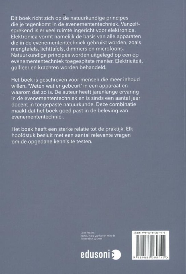 Dit boek richt zich op de gebieden in de natuurkunde die je tegenkomt in de evenemententechniek. Vanzelfsprekend is er veel ruimte ingericht voor electronica. Elektronica vormt namelijk de basis van alle apparaten die in de evenemententechniek gebruikt worden, zoals mengtafels en lichttafels, dimmers en microfoons. Natuurkundige principes worden uitgelegd op een op evenemententechniek toegespitste manier. Elektriciteit, golfleer en krachten komen voorbij. Het boek is geschreven voor mensen die meer inhoud willen. Weten wat er gebeurt in een apparaat en waarom dat zo is.