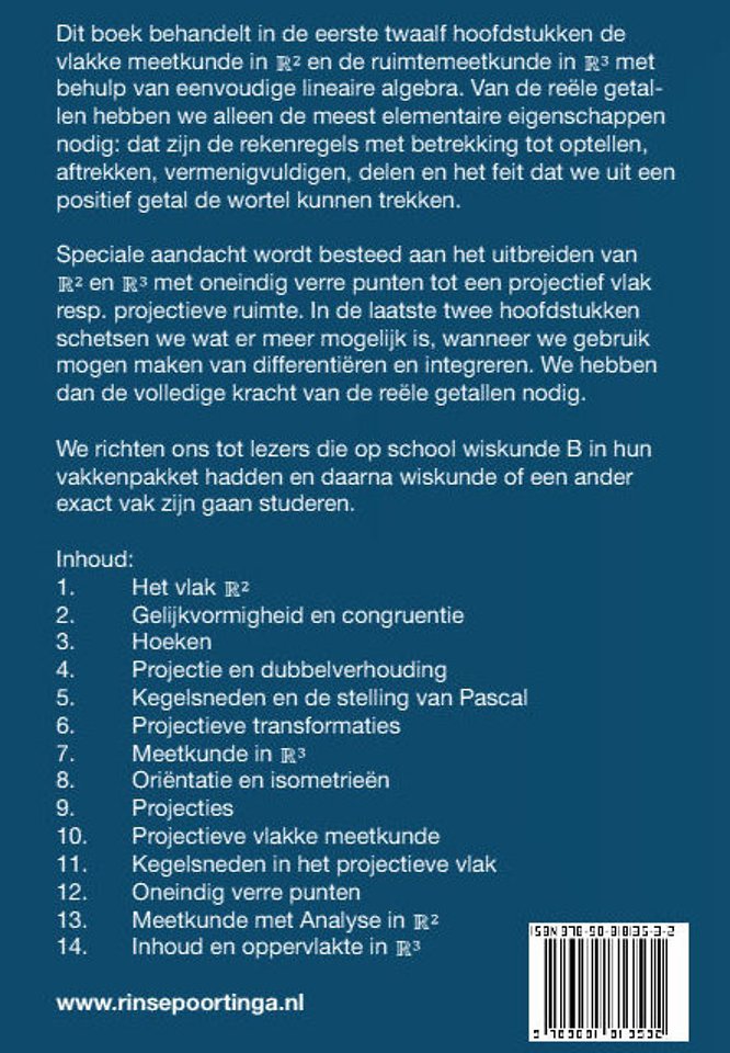 Dit boek behandelt in de eerste twaalf hoofdstukken de vlakke meetkunde en de ruimtemeetkunde met behulp van eenvoudige lineaire algebra. Van de reële getallen hebben we alleen de meest elementaire eigenschappen nodig: dat zijn de rekenregels met betrekking tot optellen, aftrekken, vermenigvuldigen, delen en het feit dat we uit een positief getal de wortel kunnen trekken. Speciale aandacht wordt besteed aan het uitbreiden van het vlak en de ruimte met oneindig verre punten tot een projectief vlak resp. projectieve ruimte. In de laatste twee hoofdstukken schetsen we wat er meer mogelijk is, wanneer we gebruik mogen maken van differentiëren en integreren. We hebben dan de volledige kracht van de reële getallen nodig.