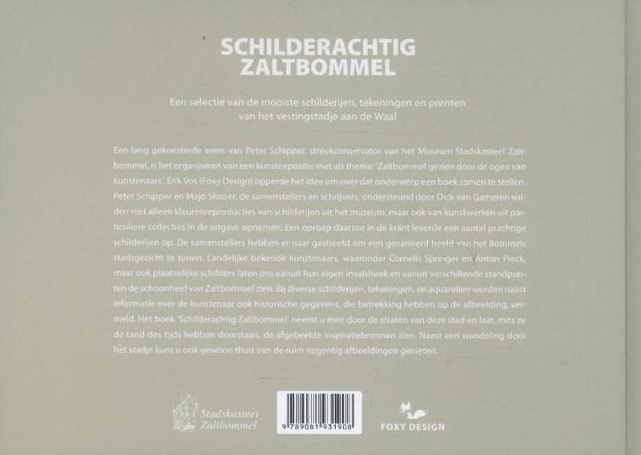 Een lang gekoesterde wens van Peter Schipper, streekconservator van het Museum Stadskasteel Zaltbommel, is het organiseren van een kunstexpositie met als thema: 'Zaltbommel gezien door de ogen van kunstenaars'. Erik Vos (Foxy Design) opperde het idee om over dat onderwerp een boek samen te stellen. Peter Schipper en Majo Slosser, de samenstellers en schrijvers, ondersteund door Dick van Gameren wilden niet alleen kleurenreproducties van schilderijen uit het museum, maar ook van kunstwerken uit particuliere collecties in de uitgave opnemen. Een oproep daartoe in de krant leverde een aantal prachtige schilderijen op. De samenstellers hebben er naar gestreefd om een gevarieerd beeld van het Bommels stadsgezicht te tonen. Landelijke bekende kunstenaars, waaronder Cornelis Springer en Anton Pieck, maar ook plaatselijke schilders laten ons vanuit hun eigen invalshoek en vanuit verschillende standpunten de schoonheid van Zaltbommel zien. Bij diverse schilderijen, tekeningen, en aquarellen worden naast informatie over de kunstenaar ook historische gegevens, die betrekking hebben op de afbeelding, vermeld. Het boek 'Schilderachtig Zaltbommel' neemt u mee door de straten van deze stad en laat, mits ze de tand des tijds hebben doorstaan, de afgebeelde inspiratiebronnen zien. Naast een wandeling door het stadje kunt u ook gewoon thuis van de ruim negentig afbeeldingen genieten.