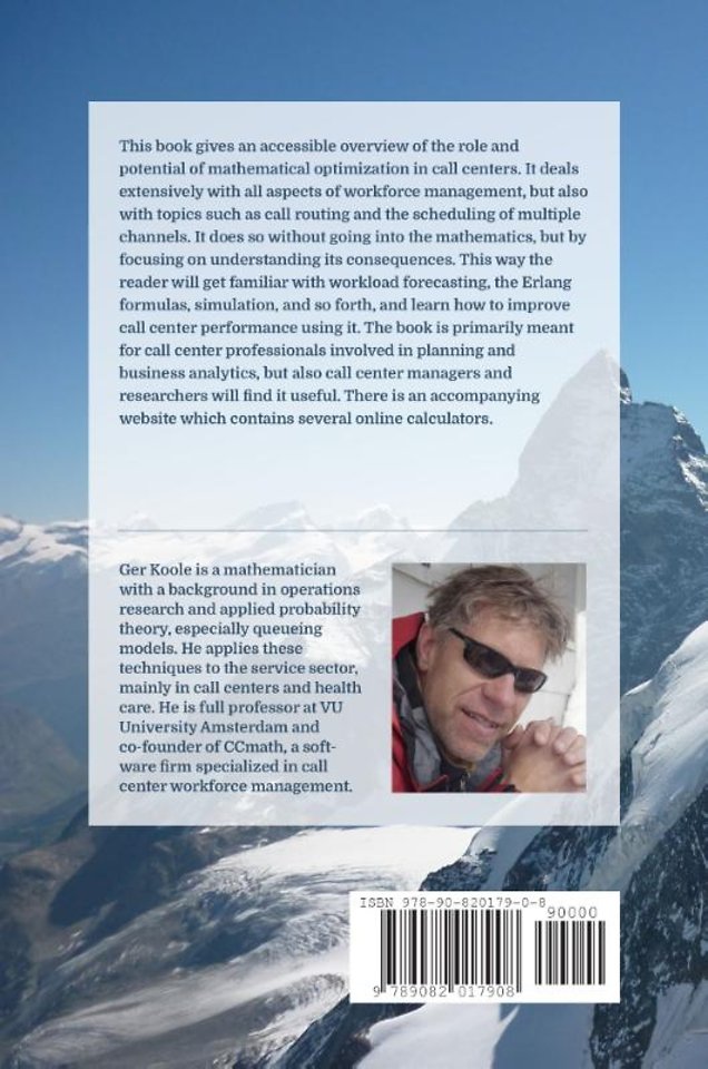 This book gives an accessible overview of the role and potential of mathematical optimization in call centers. It deals extensively with all aspects of workforce management, but also with topics such as call routing and the scheduling of multiple channels. It does so without going into the mathematics, but by focusing on understanding its consequences. This way the reader will get familiar with workload forecasting, the Erlang formulas, simulation, and so forth, and learn how to improve call center performance using it. The book is primarily meant for call center professionals involved in planning and business analytics, but also call center managers and researchers will find it useful. There is an accompanying website which contains several online calculators.