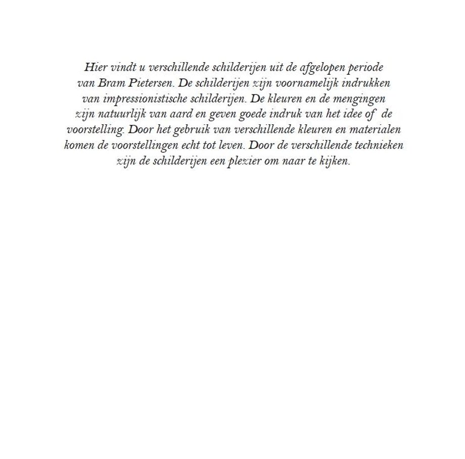 Hier vindt u verschillende schilderijen uit de afgelopen periode van Bram Pietersen. De schilderijen zijn voornamelijk indrukken van impressionistische schilderijen. De kleuren en de mengingen zijn natuurlijk van aard en geven een goede indruk van het idee of de voorstelling. Door het gebruik van verschillende kleuren en materialen komen de voorstellingen echt tot leven. Door de verschillende technieken zijn de schilderijen een plezier om naar te kijken.