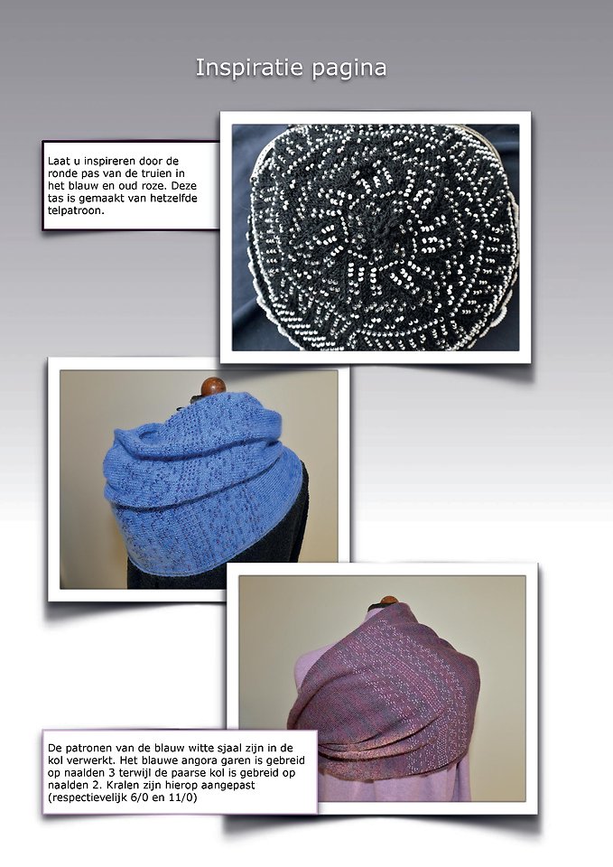 Nu zijn we met plezier de uitdaging aangegaan om de technieken die wij normaliter gebruiken om kralen tasjes te breien toe te passen in kleding. Dit tijdschrift is een inspiratie bron. Breiers die de uitdaging met kralen breien aan durven te gaan, zijn ervaren breiers en daarom zijn wij ervan uitgegaan dat men zelf de patronen kan omrekenen naar iedere gewenste maat. Bij veel modellen vindt u de patronen in maat 42/44 bij enkele modellen vindt u geen patroon. Deze dienen als inspiratie waar u zelf mee aan de slag kunt gaan.