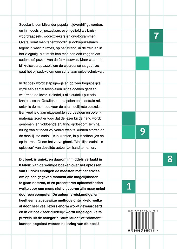 Dit boek is uniek, en daarom inmiddels vertaald in 8 talen! Van de weinige boeken over het oplossen van Sudoku eindigen de meesten met het advies om op een gegeven moment alle mogelijkheden te gaan noteren, of ze presenteren oplosmethoden welke voor een mens niet uit te voeren zijn maar enkel door een computer. De auteur is wiskundige, en heeft een stapsgewijze methode ontwikkeld welke al door heel veel lezers enorm wordt gewaardeerd en in dit boek zeer duidelijk wordt uitgelegd. Zelfs puzzels uit de categorie “cum laude” of “diamant” kunnen opgelost worden na lezing van dit boek!