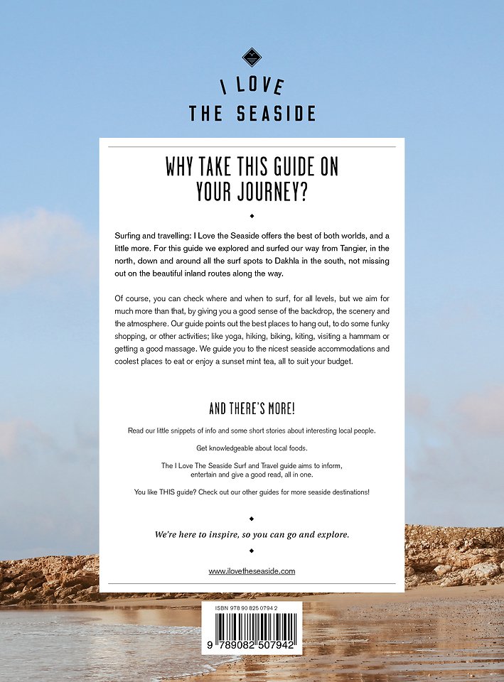 I Love the Seaside Morocco. The surf and travel guide to Morocco combineert het beste van twee werelden : reizen en surfen. Voor iedereen die zelf surft, die een partner heeft die surft of gewoonweg van de zee houdt. Gemaakt door surfers voor surfers, maar bovenal met liefde voor de zee.