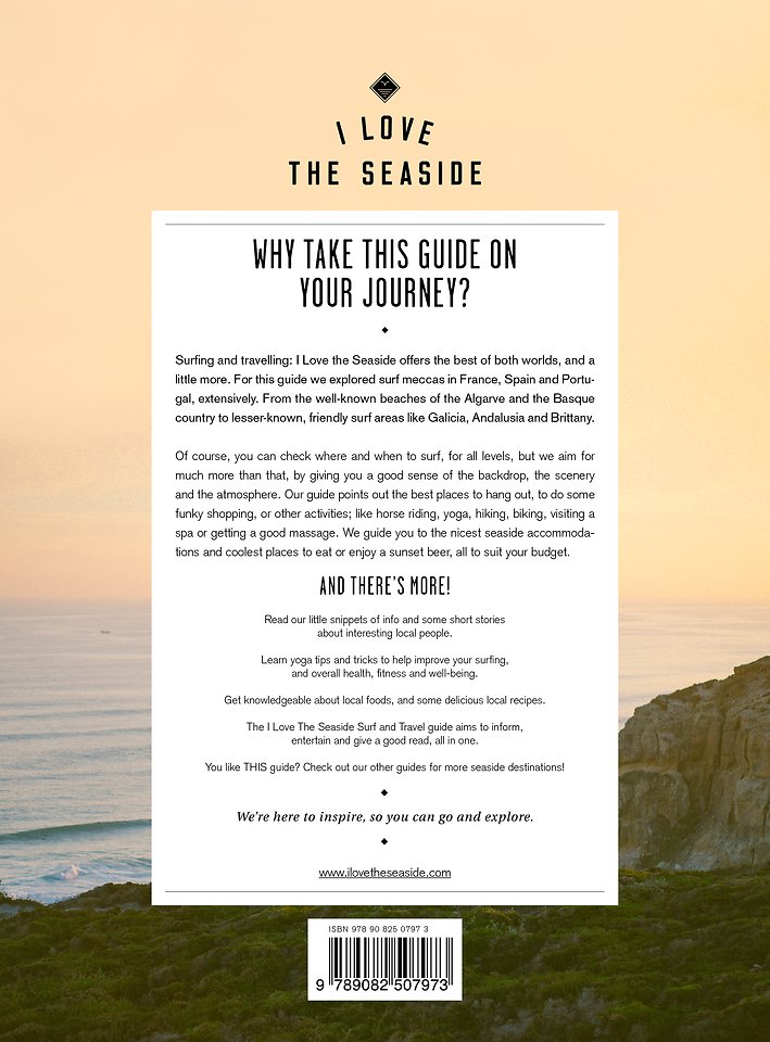 'I Love the Seaside' combineert het beste van twee werelden: reizen en surfen. Iedereen die ofwel zelf surft, een partner of familielid heeft die surft, of gewoonweg van de zee houdt, heeft met deze gids een kompas langs de Atlantische Oceaan in handen. Een boek voor alle zee- en surf liefhebbers, met de beste tips rondom de bekende surf spots langs de kust van Frankrijk, Spanje en Portugal. Dus niet alleen de surf spots zelf: wat deze gids uniek maakt is dat juist de omgeving van de spots wordt beschreven; de makers selecteerden de leukste adressen om te slapen, eten, drinken - plekken die met hart en ziel gerund worden. Ook vind je volop andere activiteiten zoals yoga, hike en bike routes, SUP, kajak, paardrijden, wijnproeven en meer. Je leest verhalen van 'seaside locals', lokale recepten en food facts en de sfeer van de plek wordt duidelijk beschreven.