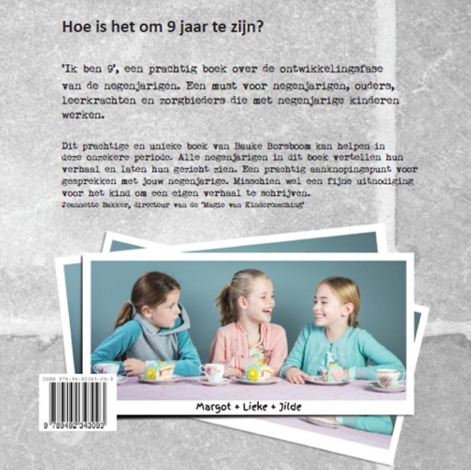 'Ik ben 9', een prachtig boek over de ontwikkelingsfase van de negenjarigen. Een must voor negenjarigen, ouders,leerkrachten en zorgbieders die met negenjarige kinderen werken. Dit prachtige en unieke boek van Bauke Borsboom kan helpen in deze onzekere periode. Alle negenjarigen in dit boek vertellen hun verhaal en laten hun gezicht zien. Een prachtig aanknopingspunt voor gesprekken met jouw negenjarige. Misschien wel een fijne uitnodiging voor het kind om een eigen verhaal te schrijven.