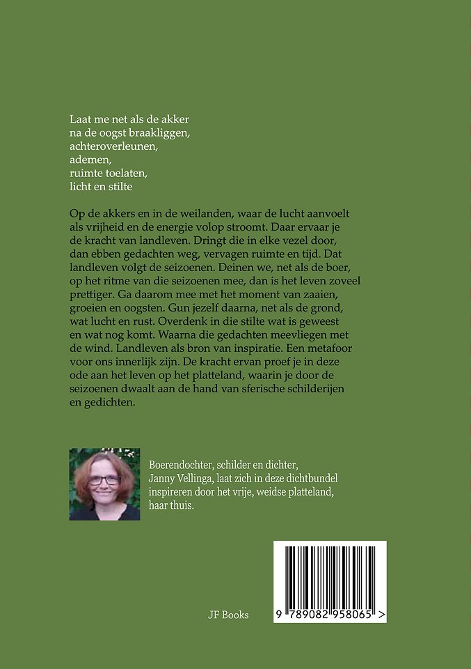 Akkers en weilanden, ingekaderd door houtwallen en sloten. Waar de lucht aanvoelt als vrijheid en de energie volop stroomt. Dat is de kracht van landleven. Dringt die in elke vezel door, dan ebben gedachten weg, vervagen ruimte en tijd. Dat landleven volgt de seizoenen. Deinen we, net als de boer, op het ritme van die seizoenen mee, dan is het leven zovel prettiger. Ga daarom mee met het moment van zaaien, groeien, oogsten. Gun jezelf daarna, net als de grond, wat lucht en rust. Overdenk in die stilte wat is geweest en wat nog komt. Waarna die gedachten mogen meevliegen met de wind. Landleven als bron van inspiratie. Een metafoor voor ons innerlijk zijn. De kracht ervan proef je in deze ode aan het leven op het platteland, waarin je door de seizoenen wandelt aan de hand van sferische schilderijen en gedichten.