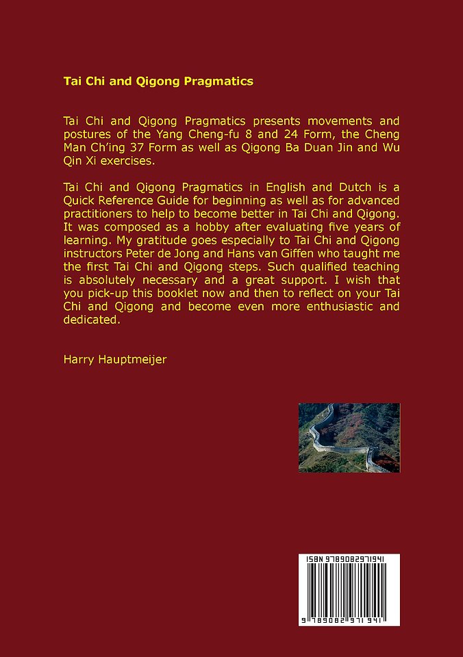 Tai Chi and Qigong Pragmatics presents movements and postures of the Yang Cheng-fu 8 and 24 Form, the Cheng Man Ch’ing 37 Form as well as Qigong Ba Duan Jin and Wu Qin Xi exercises. Tai Chi and Qigong Pragmatics in English and Dutch is a Quick Reference Guide for beginning as well as for advanced practitioners to help to become better in Tai Chi and Qigong.