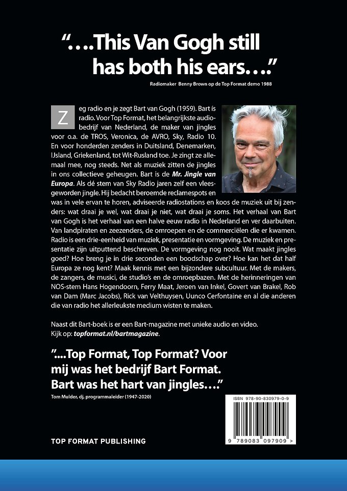 Zeg radio en je zegt Bart van Gogh (1959). Bart ís radio. Voor Top Format, het belangrijkste audiobedrijf van Nederland, de maker van jingles voor o.a. de TROS, Veronica, de AVRO, Sky, Radio 10. En voor honderden zenders in Duitsland, Denemarken, IJsland, Griekenland, tot Wit-Rusland toe. Je zingt ze allemaal mee, nog steeds. Net als muziek zitten de jingles in ons collectieve geheugen. Bart is de Mr. Jingle van Europa. Als dé stem van Sky Radio jaren zelf een vlees¬geworden jingle. Hij bedacht beroemde reclamespots en was in vele ervan te horen, adviseerde radiostations en koos de muziek uit bij zenders: wat draai je wel, wat draai je niet, wat draai je soms.