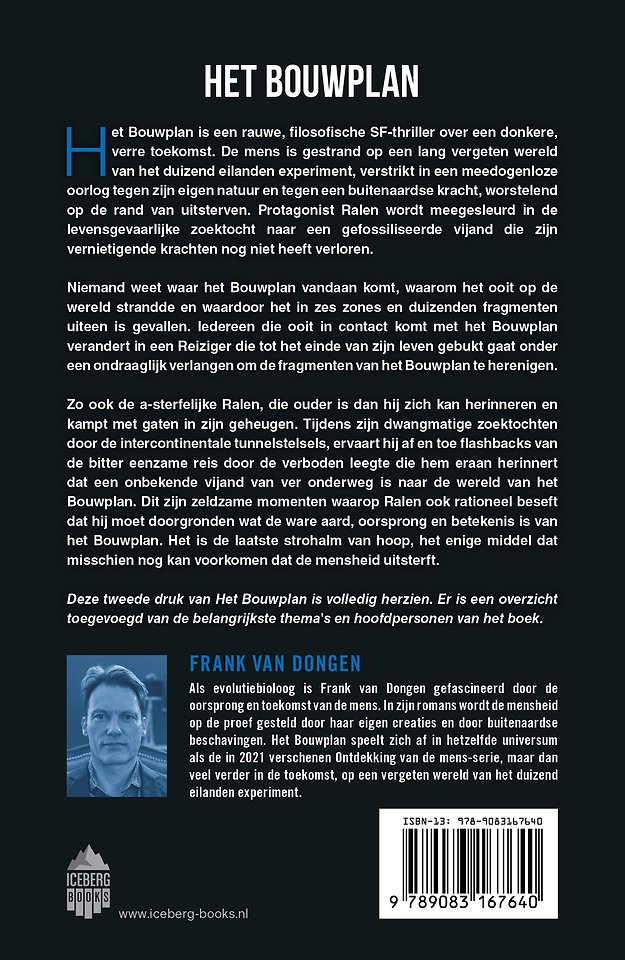 Het Bouwplan is een rauwe, filosofische SF-thriller over een donkere, verre toekomst. De mens is gestrand op een lang vergeten wereld van het duizend eilanden experiment, verstrikt in een meedogenloze oorlog tegen zijn eigen natuur en tegen een buitenaardse kracht, worstelend op de rand van uitsterven. Protagonist Ralen wordt meegesleurd in de levensgevaarlijke zoektocht naar een gefossiliseerde vijand die zijn