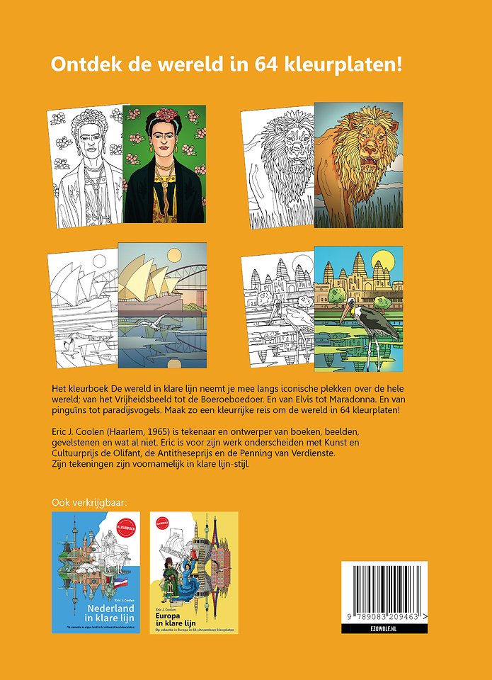Na het succes van Nederland in klare lijn en Europa in klare lijn neemt Eric J. Coolen je dit keer mee langs iconische plekken over de hele wereld. Wat te denken van het Vrijheidsbeeld, de Opera in Sydney en Angkor Wat in Cambodja. En van Elvis tot Maradonna. En van pinguïns tot paradijsvogels. Maar ook van Elvis, Frida Kahlo en vele anderen ontbreken niet. Goed voor vele uren kleurplezier!