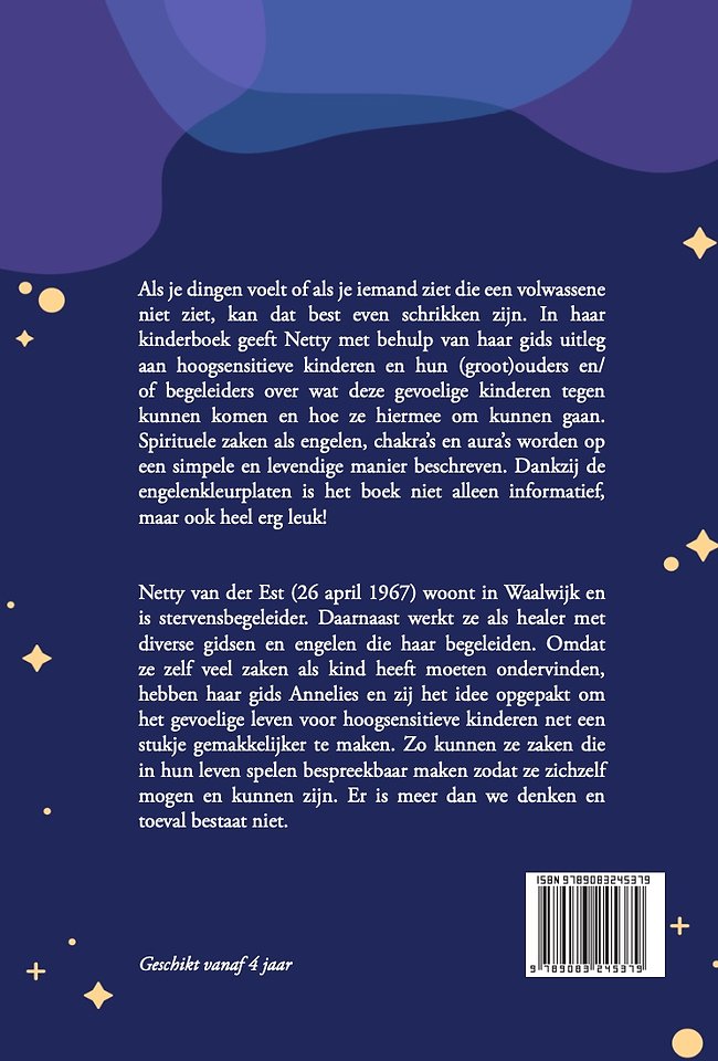 Als je dingen voelt of als je iemand ziet die een volwassene niet ziet, kan dat best even schrikken zijn. In haar kinderboek geeft Netty met behulp van haar gids uitleg aan hoogsensitieve kinderen en hun (groot)ouders en/of begeleiders over wat deze gevoelige kinderen tegen kunnen komen en hoe ze hiermee om kunnen gaan. Spirituele zaken als engelen, chakra’s en aura’s worden op een simpele en levendige manier beschreven. Dankzij de engelenkleurplaten is het boek niet alleen informatief, maar ook heel erg leuk!