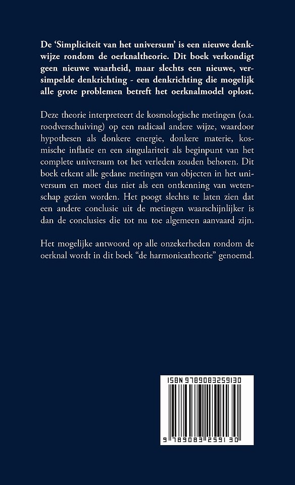 De 'Simpliciteit van het universum' is een nieuwe denkwijze rondom de oerknaltheorie. Dit boek verkondigt geen nieuwe waarheid, maar slechts een nieuwe, versimpelde denkrichting - een denkrichting die mogelijk alle grote problemen betreft het oerknalmodel oplost.