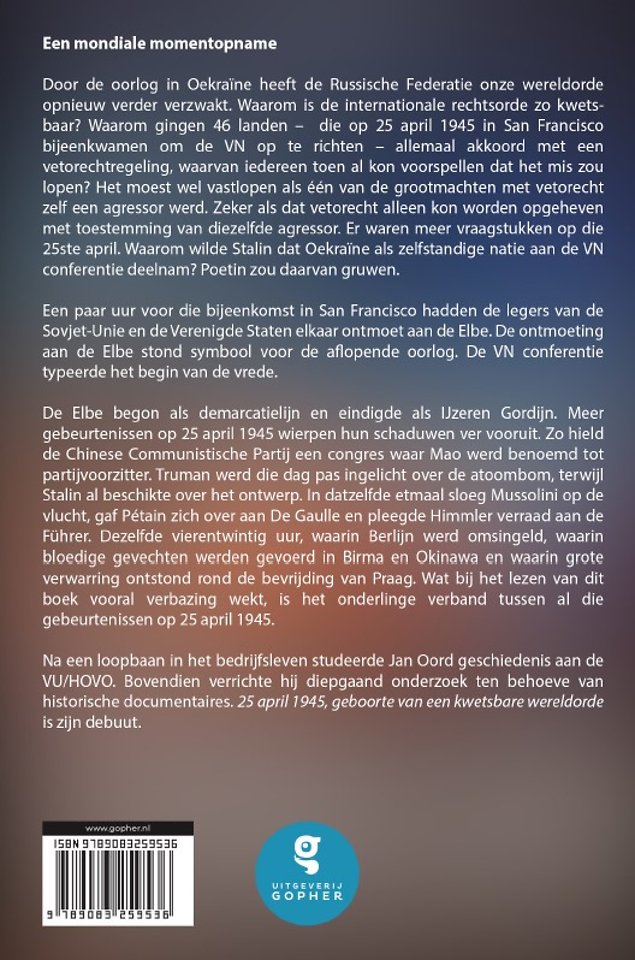 Een mondiale momentopname In een korte periode van 24 uur speelden zich verspreid over onze planeet een aantal politieke, militaire en diplomatieke gebeurtenissen af, die nauw met elkaar samenhingen. Deze omstandigheden bleken, achteraf beschouwd, kenmerkend voor het tot stand komen van de naoorlogse wereldorde. Dit boek volgt die gebeurtenissen op 25 april 1945 van uur tot
