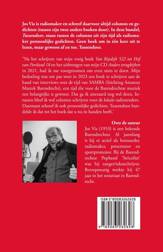 Jos Vis is radiomaker en schreef daarvoor altijd columns en gedichten (tussen zijn twee andere boeken door). In deze bundel, Tussendoor, staan tussen de columns uit zijn tijd als radiomaker persoonlijke gedichten. Geen boek om in één keer uit te lezen, maar gewoon af en toe. Tussendoor.