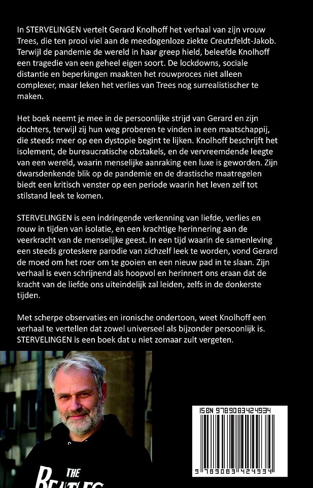 In STERVELINGEN vertelt Gerard Knolhoff het verhaal van zijn vrouw Trees, die ten prooi viel aan de meedogenloze ziekte Creutzfeldt-Jakob. Terwijl de pandemie de wereld in haar greep hield, beleefde Knolhoff een tragedie van een geheel eigen soort. De lockdowns, sociale distantie en beperkingen maakten het rouwproces niet alleen complexer, maar leken het verlies van Trees nog surrealistischer te maken.
