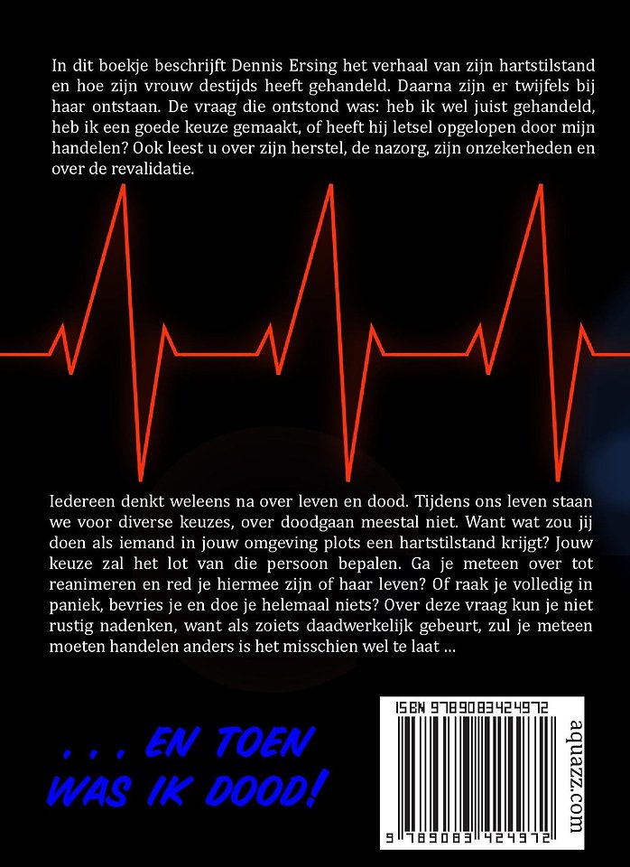 In dit boekje beschrijft Dennis Ersing het verhaal van zijn hartstilstand en hoe zijn vrouw destijds heeft gehandeld. Daarna zijn er twijfels bij haar ontstaan. De vraag die ontstond was: heb ik wel juist gehandeld, heb ik een goede keuze gemaakt, of heeft hij letsel opgelopen door mijn handelen? Ook leest u over zijn herstel, de nazorg, zijn onzekerheden en over de revalidatie.