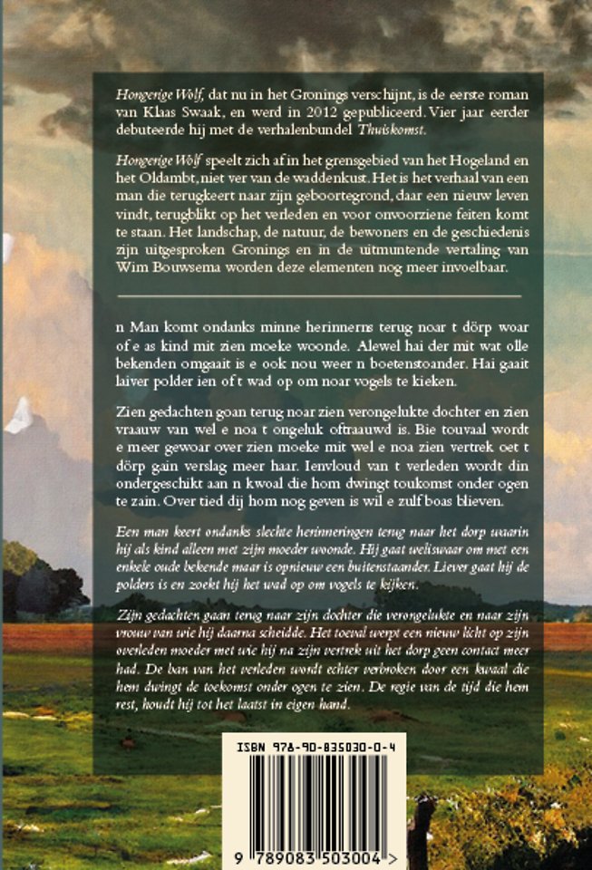Hongerige Wolf, dat nu in het Gronings verschijnt, is de eerste roman van Klaas Swaak, en werd in 2012 gepubliceerd. Vier jaar eerder debuteerde hij met de verhalenbundel Thuiskomst. Hongerige Wolf speelt zich af in het grensgebied van het Hogeland en het Oldambt, niet ver van de waddenkust. Het is het verhaal van een man die terugkeert naar zijn geboortegrond, daar een nieuw leven vindt, terugblikt op het verleden en voor onvoorziene feiten komt te staan. Het landschap, de natuur, de bewoners en de geschiedenis zijn uitgesproken Gronings en in de uitmuntende vertaling van Wim Bouwsema worden deze elementen nog meer invoelbaar.