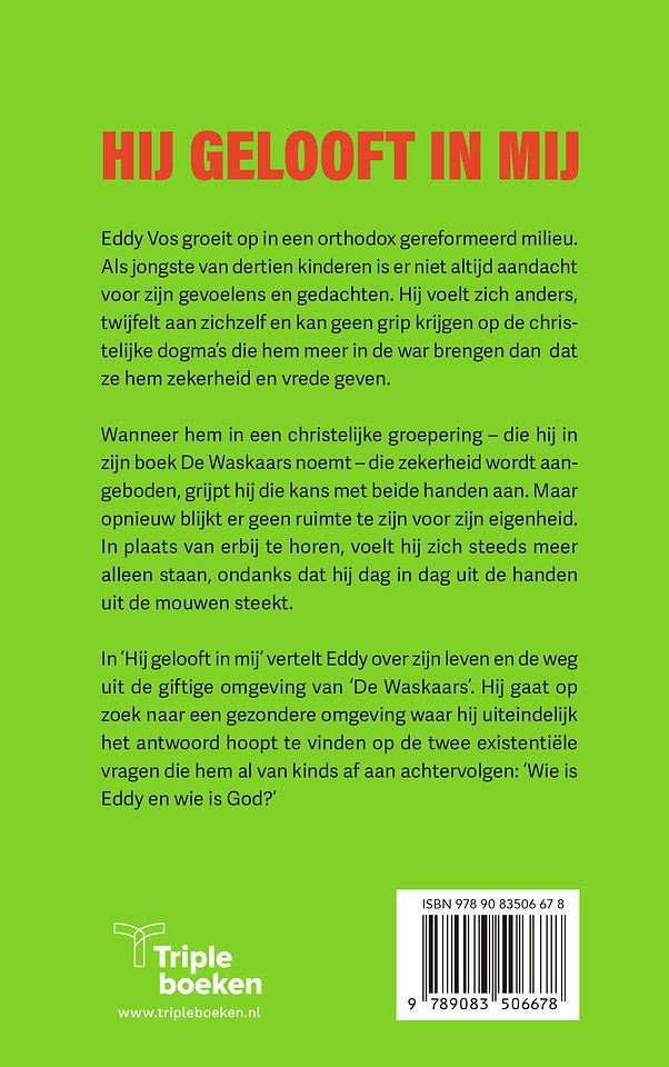 In ’Hij gelooft in mij’ vertelt Eddy over zijn leven en de weg uit de giftige omgeving van ‘De Waskaars’. Hij gaat op zoek naar een gezondere omgeving waar hij uiteindelijk het antwoord hoopt te vinden op de twee existentiële vragen die hem al van kinds af aan achtervolgen: ‘Wie is Eddy en wie is God?’