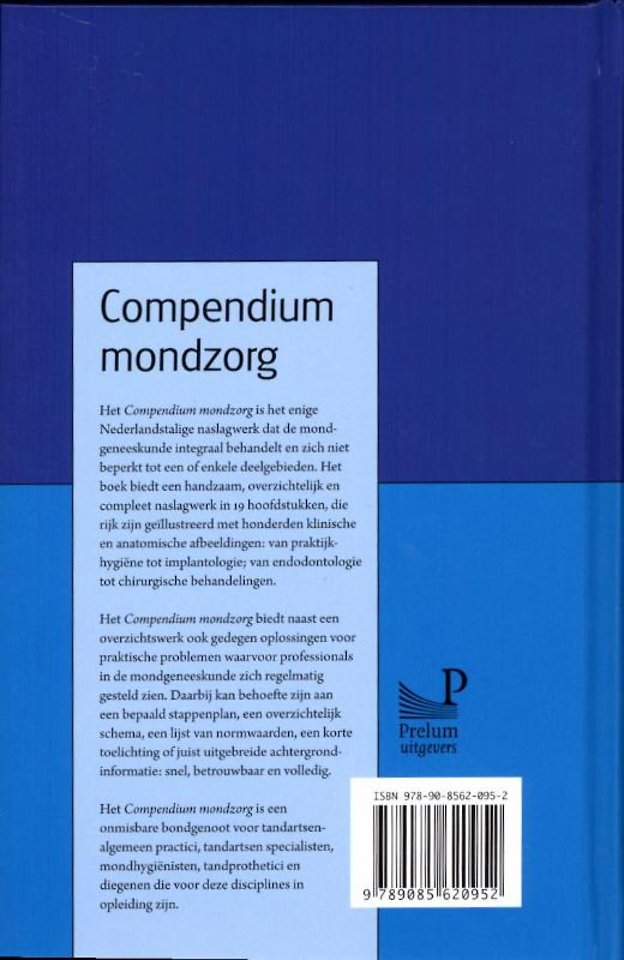 Het Compendium mondzorg is het enige Nederlandstalige naslagwerk dat de mondgeneeskunde en mondzorg integraal behandelt en zich niet beperkt tot een of enkele deelgebieden. Het boek biedt een handzaam, overzichtelijk en compleet naslagwerk in 19 hoofdstukken, die rijk zijn geïllustreerd met honderden klinische en anatomische afbeeldingen: van praktijkhygiëne tot implantologie; van endodontologie tot chirurgische behandelingen.