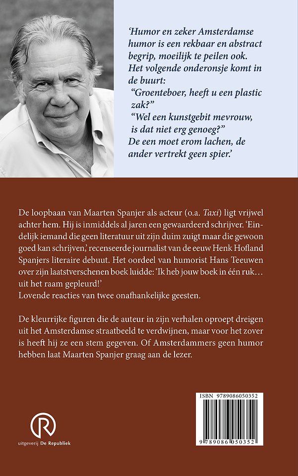 De kleurrijke figuren die de auteur in zijn verhalen oproept dreigen uit het Amsterdamse straatbeeld te verdwijnen, maar voor het zover is heeft hij ze een stem gegeven. Of Amsterdammers geen humor hebben laat Maarten Spanjer graag aan de lezer.