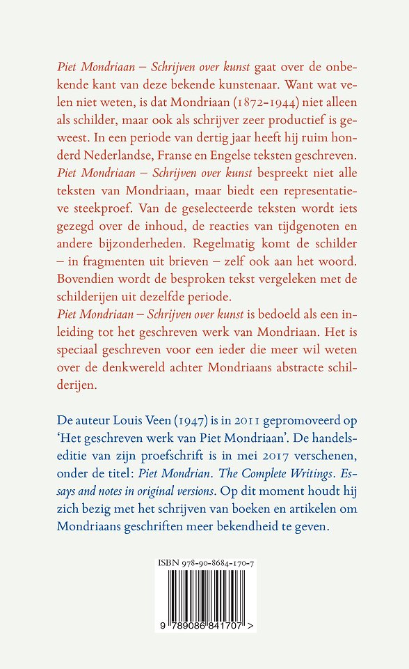 De auteur Louis Veen (*1947) is in 2011 gepromoveerd op ‘Het geschreven werk van Piet Mondriaan’. De handelseditie van zijn proefschrift is in mei 2017 verschenen, onder de titel: Piet Mondrian. The Complete Writings. Essays and notes in original versions. Op dit moment houdt hij zich bezig met het schrijven van boeken en artikelen om Mondriaans geschriften meer bekendheid te geven.
