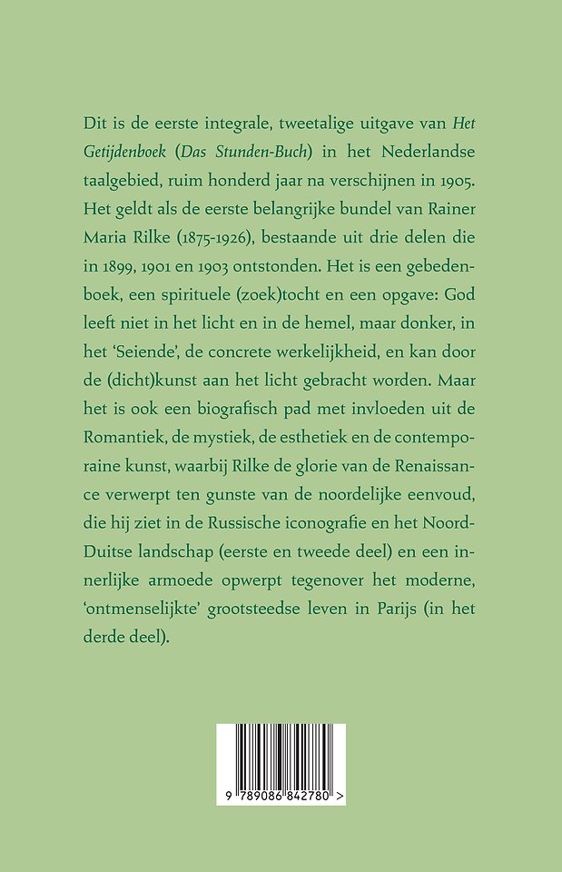Dit is de eerste integrale, tweetalige uitgave van Het Getijdenboek (Das Stunden-Buch) in het Nederlandse taalgebied, ruim honderd jaar na verschijnen in 1905. Het geldt als de eerste belangrijke bundel van Rainer Maria Rilke (1875-1926), bestaande uit drie delen die in 1899, 1901 en 1903 ontstonden. Het is een gebedenboek, een spirituele (zoek)tocht en een opgave: God leeft niet in het licht en in de hemel, maar donker, in het ‘Seiende’, de concrete werkelijkheid, en kan door de (dicht)kunst aan het licht gebracht worden. Maar het is ook een biografisch pad met invloeden uit de Romantiek, de mystiek, de esthetiek en de contemporaine kunst, waarbij Rilke de glorie van de Renaissance verwerpt ten gunste van de noordelijke eenvoud, die hij ziet in de Russische iconografie en het Noord-