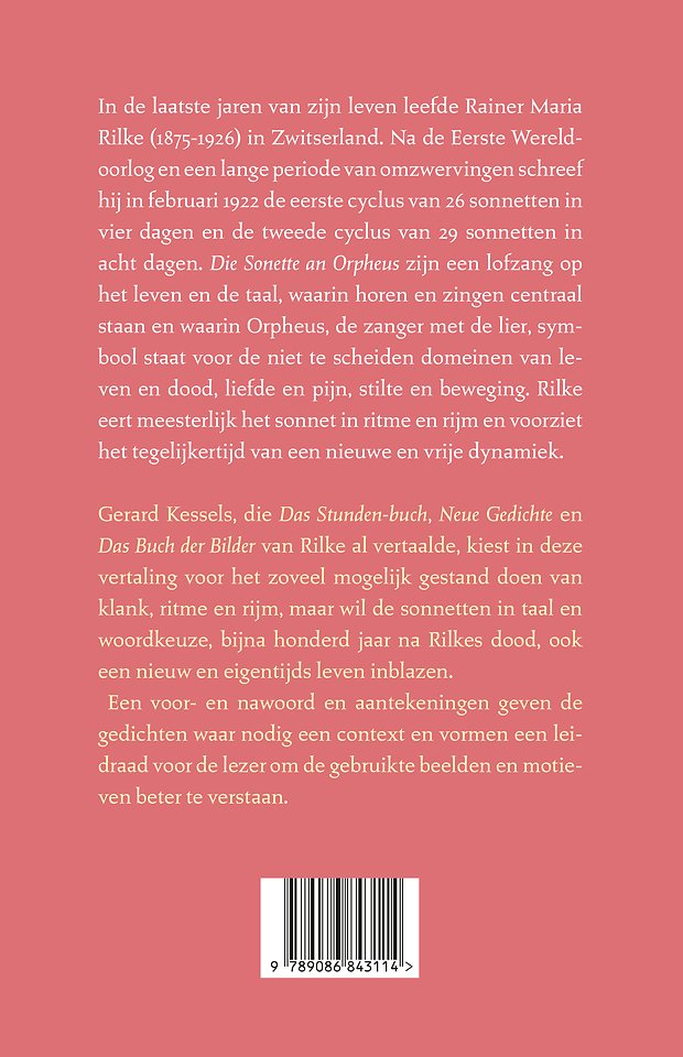 In de laatste jaren van zijn leven leefde Rainer Maria Rilke (1875-1926) in Zwitserland. Na de Eerste Wereldoorlog en een lange periode van omzwervingen schreef hij in februari 1922 de eerste cyclus van 26 sonnetten in vier dagen en de tweede cyclus van 29 sonnetten in acht dagen. Die Sonette an Orpheus zijn een lofzang op het leven en de taal, waarin horen en zingen centraal staan en waarin Orpheus, de zanger met de lier, symbool staat voor de niet te scheiden domeinen van leven en dood, liefde en pijn, stilte en beweging. Rilke eert meesterlijk het sonnet in ritme en rijm en voorziet het tegelijkertijd van een nieuwe en vrije dynamiek.