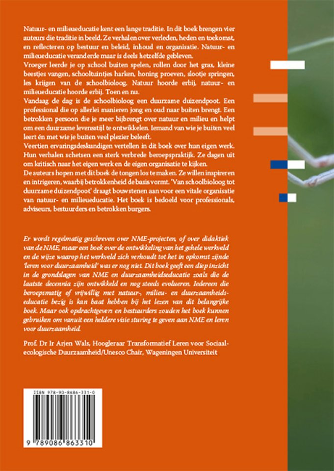 "Er wordt regelmatig geschreven over NME-projecten, of over didaktiek van de NME, maar een boek over de ontwikkeling van het gehele werkveld en de wijze waarop het werkveld zich verhoudt tot het in opkomst zijnde 'leren voor duurzaamheid' was er nog niet. Dit boek geeft een diep inzicht in de grondslagen van NME en duurzaamheidseducatie zoals die de laatste decennia zijn ontwikkeld en nog steeds evolueren. Iedereen die beroepsmatig of vrijwillig met natuur-, milieu- en duurzaamheids-educatie bezig is kan baat hebben bij het lezen van dit belangrijke boek. Maar ook opdrachtgevers en bestuurders zouden het boek kunnen gebruiken om vanuit een heldere visie sturing te geven aan NME en leren voor duurzaamheid."