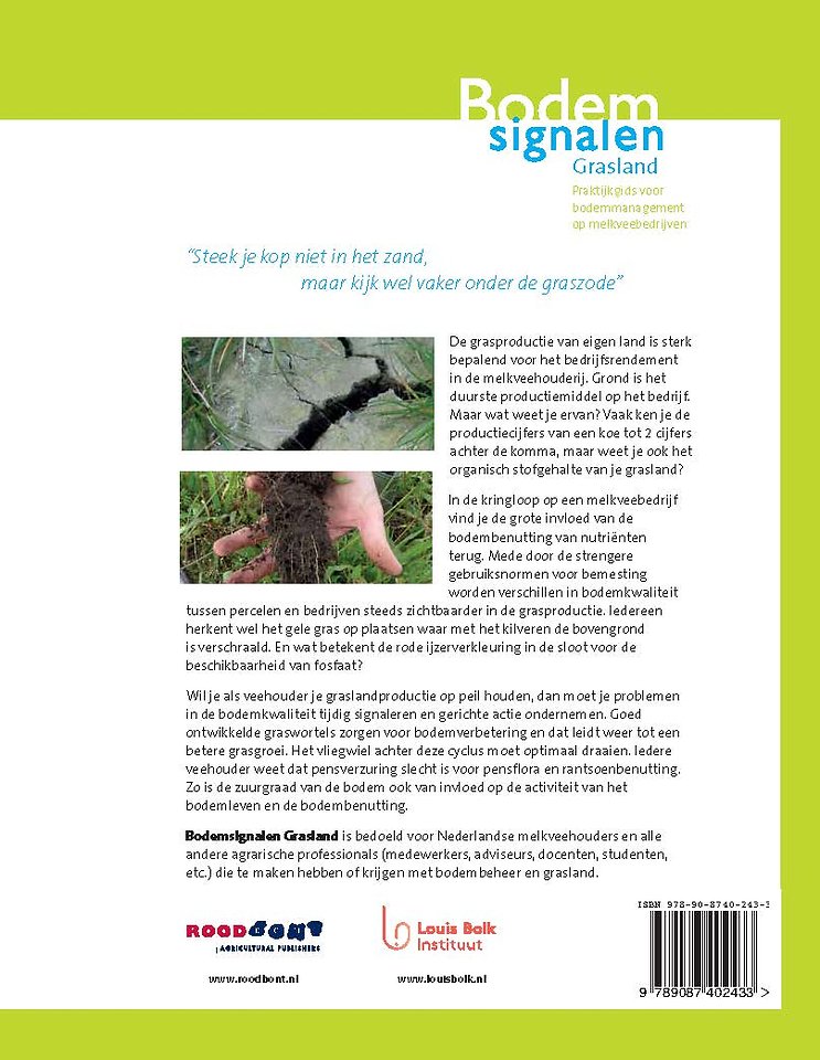 De grasproductie van eigen land is sterk bepalend voor het bedrijfsrendement in de melkveehouderij. Grond is het duurste productiemiddel op het bedrijf. Maar wat weet je ervan? Vaak ken je de productiecijfers van een koe tot 2 cijfers achter de komma, maar weet je ook het organisch stofgehalte van je grasland? In de kringloop op een melkveebedrijf vind je de grote invloed van de bodembenutting van nutriënten terug. Mede door de strengere gebruiksnormen voor bemesting worden verschillen in bodemkwaliteit tussen percelen en bedrijven steeds zichtbaarder in de grasproductie. Iedereen herkent wel het gele gras op plaatsen waar met het kilveren de bovengrond is verschraald. En wat betekent de rode ijzerverkleuring in de sloot voor de beschikbaarheid van fosfaat? Wil je als veehouder je graslandproductie op peil houden, dan moet je problemen in de bodemkwaliteit tijdig signaleren en gerichte actie ondernemen. Goed ontwikkelde graswortels zorgen voor bodemverbetering en dat leidt weer tot een betere grasgroei. Het vliegwiel achter deze cyclus moet optimaal draaien. Iedere veehouder weet dat pensverzuring slecht is voor pensflora en rantsoenbenutting. Zo is de zuurgraad van de bodem ook van invloed op de activiteit van het bodemleven en de bodembenutting. Bodemsignalen Grasland is bedoeld voor Nederlandse melkveehouders en alle andere agrarische professionals (medewerkers, adviseurs, docenten, studenten, etc.) die te maken hebben of krijgen met bodembeheer en grasland.