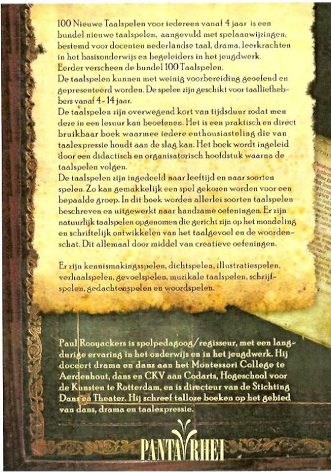 100 Nieuwe Taalspelen voor iedereen vanaf 4 jaar is een bundel nieuwe taalspelen, aangevuld met spelaanwijzingen, bestemd voor docenten nederlandse taal, drama, leerkrachten in het basisonderwijs en begeleiders in het jeugdwerk. Eerder verscheen de bundel 100 Taalspelen.