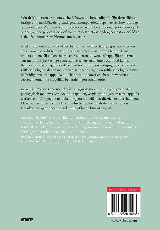 Meike Grol en Nienke Kool beschrijven wat zelfbeschadiging is, hoe cliënten ertoe komen om dit te doen en hoe u als hulpverlener deze cliënten kunt ondersteunen. Zij vullen theorie en resultaten uit wetenschappelijk onderzoek aan met praktijkervaringen van hulpverleners en cliënten. Aan bod komen thema’s als verslaving, het onderscheid tussen zelfbeschadiging en suïcidaliteit, zelfbeschadiging als een manier van aandacht vragen en zelfbeschadiging binnen de huidige maatschappij. Aan de hand van theoretische beschouwingen en casussen komen de mogelijke behandelingen aan de orde.