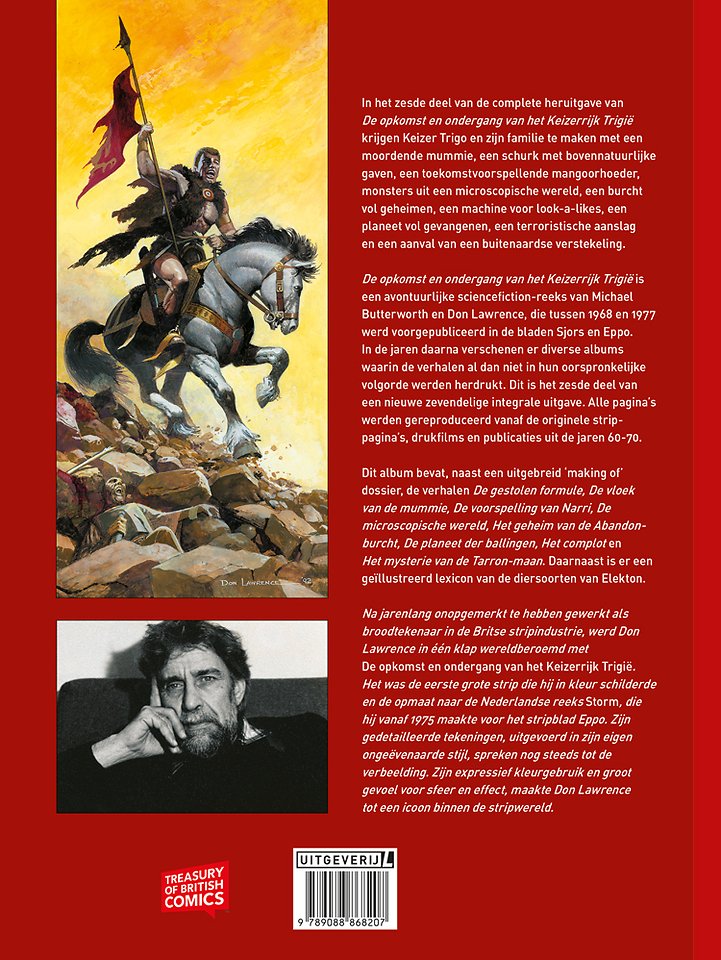 De opkomst en ondergang van het Keizerrijk Trigië is een avontuurlijke sciencefiction-reeks van Michael Butterworth en Don Lawrence, die tussen 1968 en 1977 werd voorgepubliceerd in de bladen Sjors en Eppo. In de jaren daarna verschenen er diverse albums waarin de verhalen al dan niet in hun oorspronkelijke volgorde werden herdrukt. Dit is het zesde deel van een nieuwe zevendelige integrale uitgave. Alle pagina’s werden gereproduceerd vanaf de originele strippagina’s, drukfilms en publicaties uit de jaren 60-70.