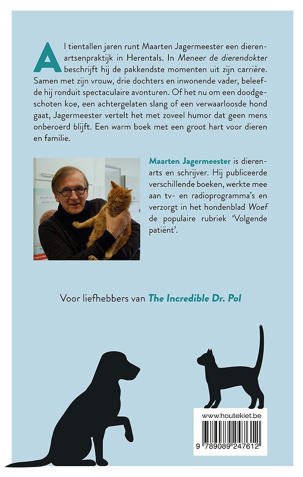 Al tientallen jaren runt Maarten Jagermeester een dierenartsenpraktijk in Herentals. In Meneer de dierendokter beschrijft hij de meest pakkende momenten uit zijn carrière. Samen met zijn vrouw, drie dochters en inwonende vader, beleefde hij ronduit spectaculaire avonturen. Of het nu om een doodgeschoten koe, een achtergelaten slang of een verwaarloosde hond gaat, Jagermeester vertelt het met zoveel humor dat geen mens onberoerd blijft.