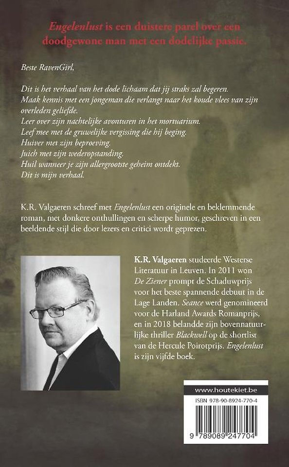 K.R. Valgaeren schreef met Engelenlust een originele en beklemmende roman, met donkere onthullingen en scherpe humor, geschreven in een beeldende stijl die door lezers en critici wordt geprezen.