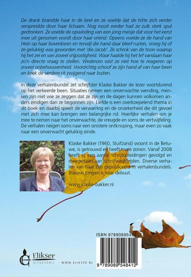 Klaske Bakker (1960, Stuifzand) woont in de Betuwe, is getrouwd en heeft twee zonen. Vanaf 2008 heeft zij een aantal schrijfopleidingen gevolgd en meegedaan aan schrijfwedstrijden. Diverse verhalen van haar zijn gepubliceerd in verhalenbundels. Blauwe tongen is haar debuut.