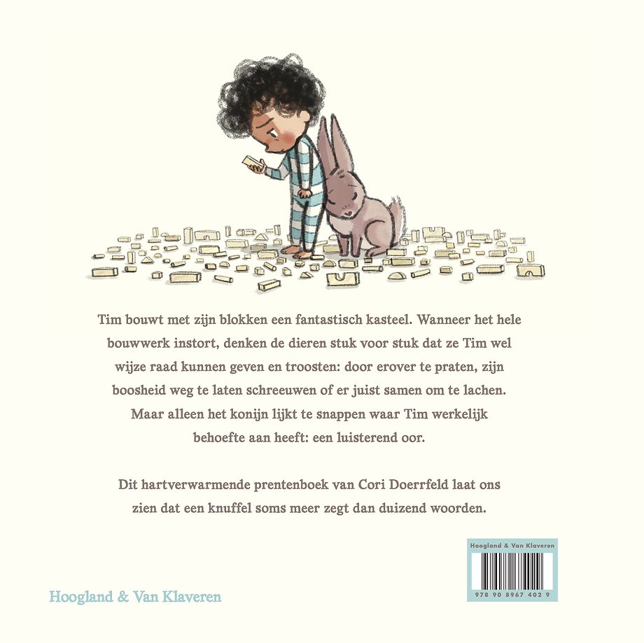 Tim bouwt met zijn blokken een fantastisch kasteel. Wanneer het hele bouwwerk instort, denken de dieren stuk voor stuk dat ze Tim wel wijze raad kunnen geven en troosten: door erover te praten, zijn boosheid weg te laten schreeuwen of er juist samen om te lachen. Maar alleen het konijn lijkt te snappen waar Tim werkelijk behoefte aan heeft: een luisterend oor.